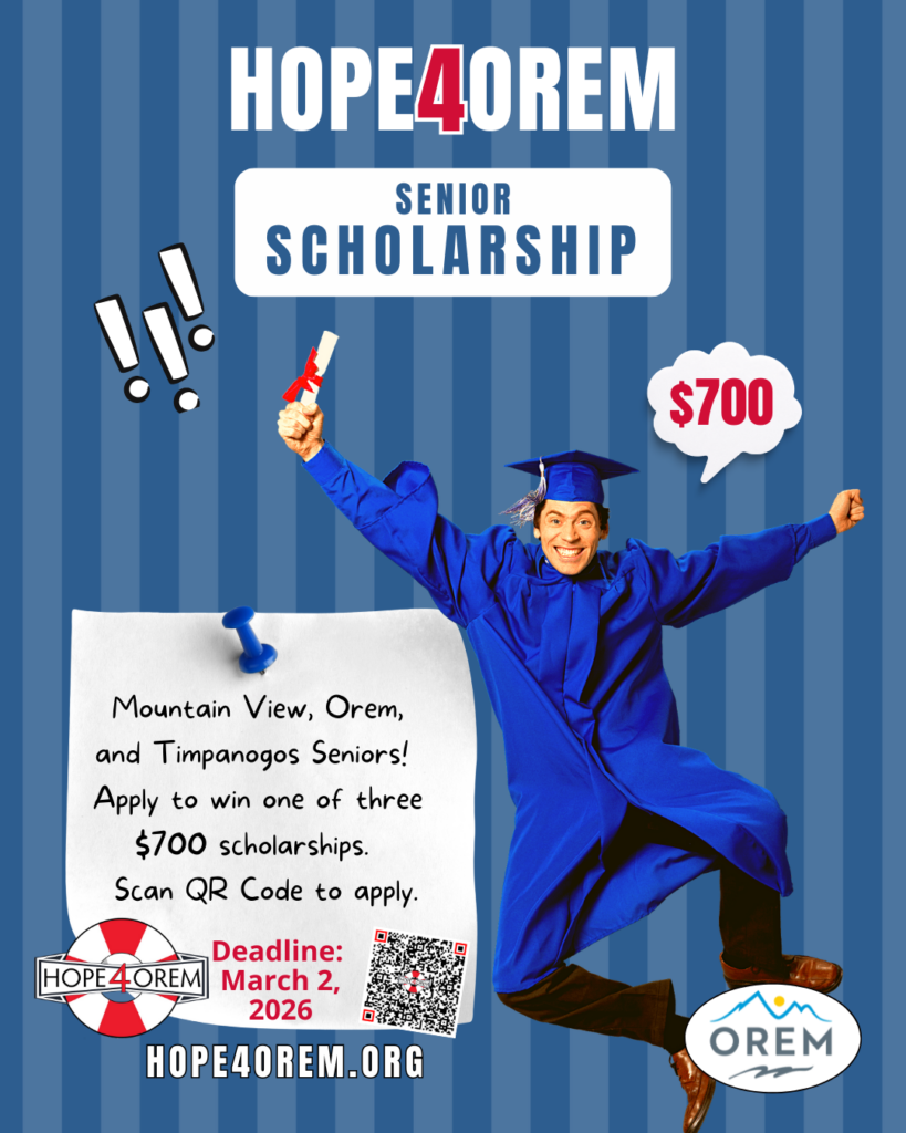 The 2026 Hope4Orem / Orem City Kindness Scholarship is now open! This year, one $700 scholarship will be awarded to a graduating senior from each Orem high school—Timpanogos, Mountain View, and Orem High—recognizing students who lead with kindness, service, and compassion in their school and community. Applications open February 2 and close March 2. We are proud to support students who make Orem a better place through everyday acts of kindness and a commitment to uplifting others.
